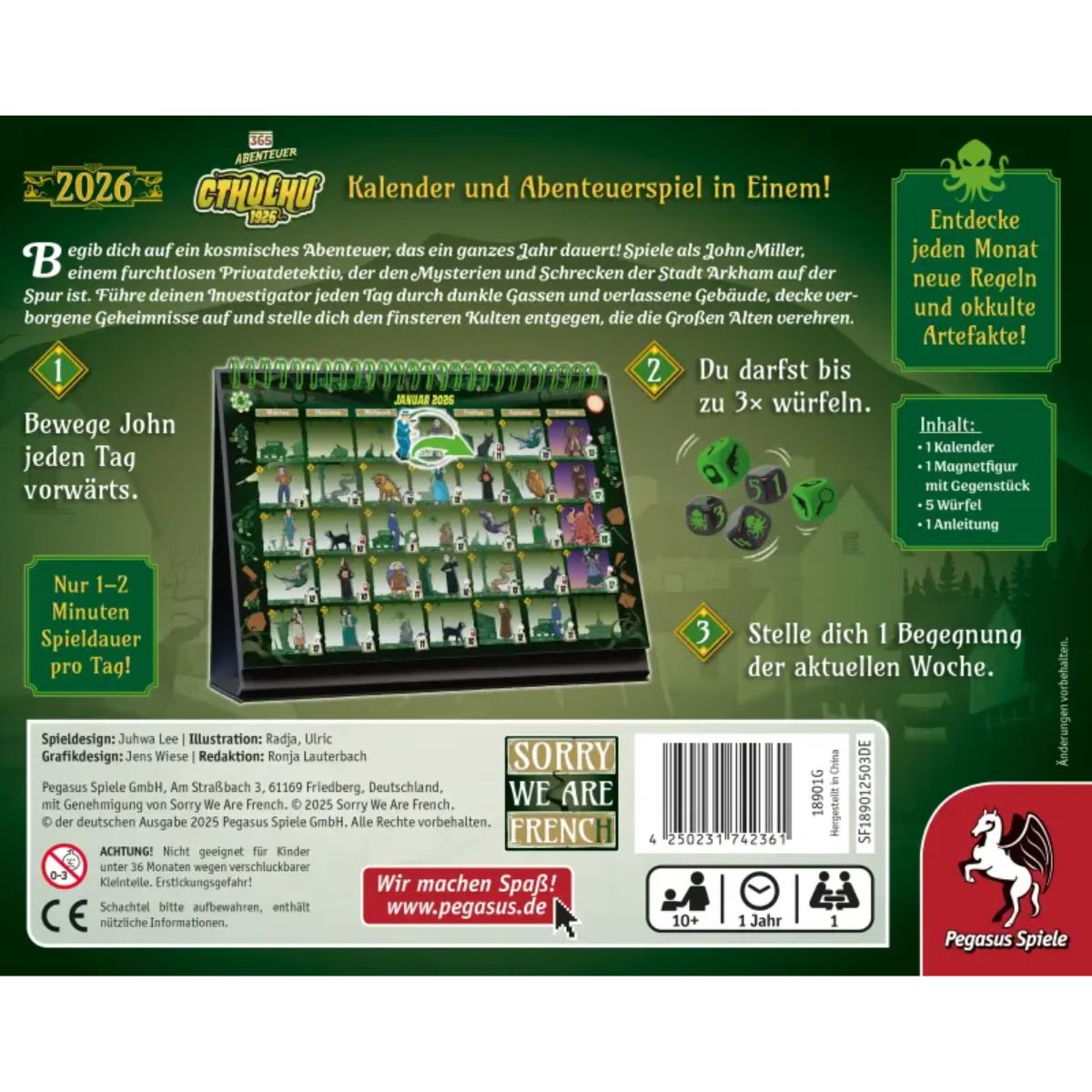 Gerüchte über mysteriöse Kreaturen und dunkle Kulte häufen sich in der rätselhaften Stadt Arkham. Doch der Privatdetektiv John Miller ist bereit, mit Pistole und Taschenlampe in die Dunkelheit einzutauchen und den Geheimnissen auf die Spur kommen … Mit 365 Adventures – Cthulhu 1926 schlüpfen die Spielenden für ein ganzes Jahr lang in die Rolle des Privatdetektivs John Miller und begeben sich auf ein kosmisches Abenteuer, das sie in dunkle Gassen und verlassene Gebäude der mysteriösen Stadt Arkham führt. Jeden Tag handeln sie eine neue Begegnung ab und entdecken neue verborgene Geheimnisse um finstere Kulte, die die Großen Alten verehren. Für jede erfolgreich besiegte Sonderbegegnung am Sonntag gibt es Punkte, aber jeden Tag steigt auch die Wahrscheinlichkeit, wahnsinnig zu werden ... Zu Beginn jedes neuen Monats erfahren die Spielenden, wie Johns Geschichte weitergeht. Außerdem kommen nun auch neue Regeln oder magische Artefakte ins Spiel. Für ihr tägliches Abenteuer brauchen die Spielenden maximal 5 Minuten und das Spielprinzip von 365 Adventures – Cthulhu 1926 ist schnell erklärt: Zunächst wird der magnetische Held auf dem Kalender zum aktuellen Tag bewegt, dann dürfen die Spielenden bis zu drei Mal würfeln, um eine Begegnung der aktuellen Woche abzuhandeln. Am Ende des Monats, zählen sie die erreichten Punkte zusammen und betreten das nächste Kapitel in der Stadt voller Rätsel und uralter Geheimnisse.