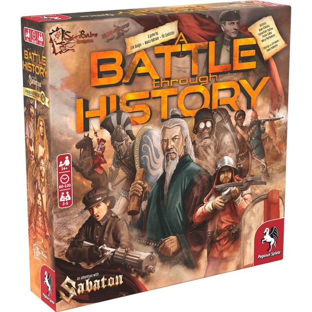 In A Battle Through History schlüpfen die Spielenden in die Rollen zeitreisender Geschichtenerzähler („Sabaton“). Dazu können sie sich zu Beginn jeder Partie ihren Lieblingscharakter der Heavy Metal Band Sabaton auswählen - verkörpert durch detaillierte Miniaturen der fünf Musiker. Auf ihren Reisen durch historische Epochen erleben sie epische (und oft unwahrscheinliche) Kämpfe an der Seite legendärer Truppen und Held*innen nach. Dabei können sich die Spielenden „der Geschichte“ stellen (repräsentiert durch Karten auf dem Spielbrett) oder ihre Gegner*innen herausfordern indem sie Bogenschützen, Panzer, Flugzeuge, Wikinger und alle möglichen anderen Truppen einsetzen, die sie bei ihren Reisen durch die Epochen „erobern“ konnten. Darüber hinaus erweitern die Sabaton ihr Wissen indem sie wertvolle Relikte sammeln und so Punkte erhalten, die zum Spielsieg nötig sind. Wer die meisten Einheiten, Held*innen und Relikte während der Reisen durch die Epochen einsammeln konnte, gewinnt das Spiel und kann diese Heldentaten besingen!Seid ihr bereit, echte Sabaton zu sein?