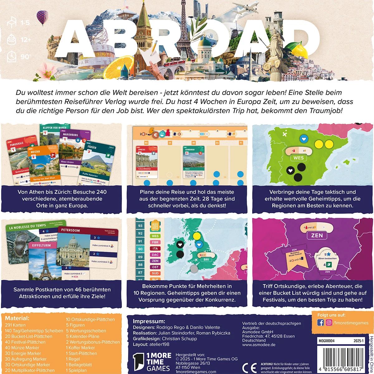 Abroad ist ein strategisches Reisespiel, das dich auf einen spannenden Trip durch Europa entführt. In 28 Tagen bereist du faszinierende Regionen, sammelst Postkarten, entdeckst Geheimtipps und besuchst Festivals – alles im Wettstreit um den besten Reiseverlauf. Plane deine Route clever, nutze deine Zeit taktisch und erfülle Ziele, um möglichst viele Punkte zu sammeln. Wer am Ende die beste Kombination aus Planung, Flexibilität und Entdeckungsglück vorweisen kann, gewinnt – und wird zum offiziellen Reiseexperten Europas!