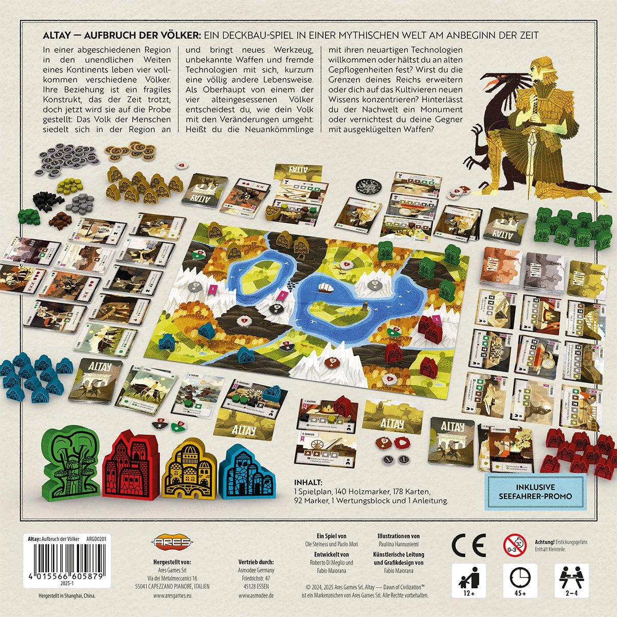 Altay: Aufbruch der Völker ist ein strategisches Zivilisationsspiel für 2–4 Spieler ab 12 Jahren. Es kombiniert Deck-Building, Ressourcenmanagement und Area-Control in einer mythischen Welt. Jede Fraktion verfügt über ein individuelles Starterdeck und verfolgt eigene Strategien, um durch Expansion, Technologie und kulturelle Leistungen den Sieg zu erringen.