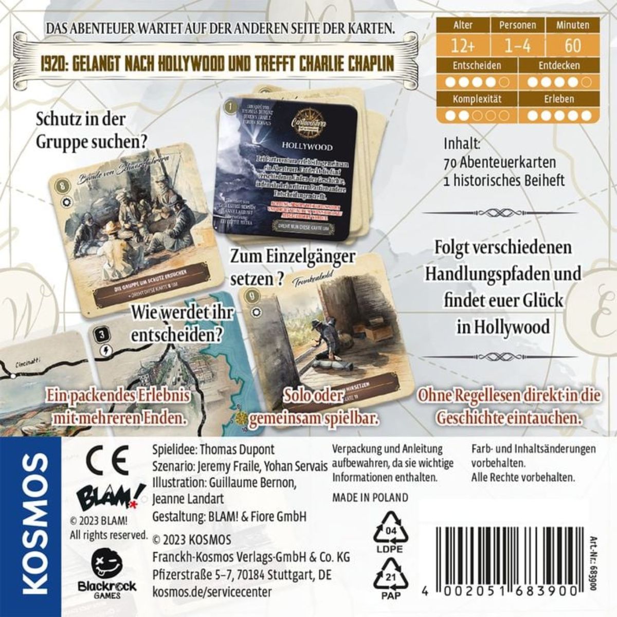 Auf nach Hollywood! Wie im Jahr 1920 Charlie Chaplin in „Der Tramp“, suchen ein bis vier Spielerinnen und Spieler ihr Glück in der Traumfabrik. Sie lassen alles hinter sich und durchqueren das Land mit einem Ziel: Genauso berühmt zu werden! Einfache Regeln führen schnell hinein ins Geschehen. Mit jeder Karte entwickelt sich die spannende Geschichte weiter: Einige Karten zeigen Orte, andere stellen die Gruppe vor wegweisende Entscheidungen. Welchen Ausgang der Geschichte werden sie wählen? Mit dem kompakten Kartenspiel den Lauf der Geschichte gemeinsam mit realen historischen Persönlichkeiten erleben. Inhalt:70 Karten1 Beiheft