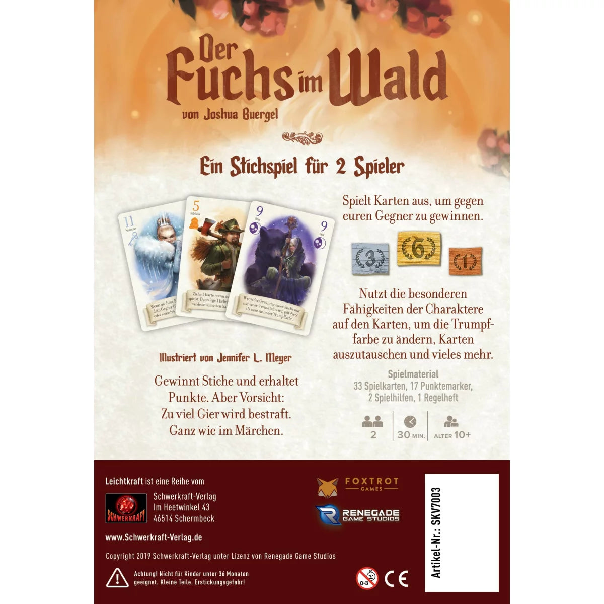 Der Fuchs im Wald ist ein Stichspiel für zwei Spieler, die über mehrere Runden Karten spielen, um Stiche zu gewinnen. Die Spieler erhalten Punkte durch den Gewinn von Stichen, die bestimmte Karten enthalten, sowie zum Ende jeder Runde je nach Anzahl ihrer gewonnen Stiche. Der Spieler mit den meisten Punkten zum Ende des Spiels ist der Spielsieger.