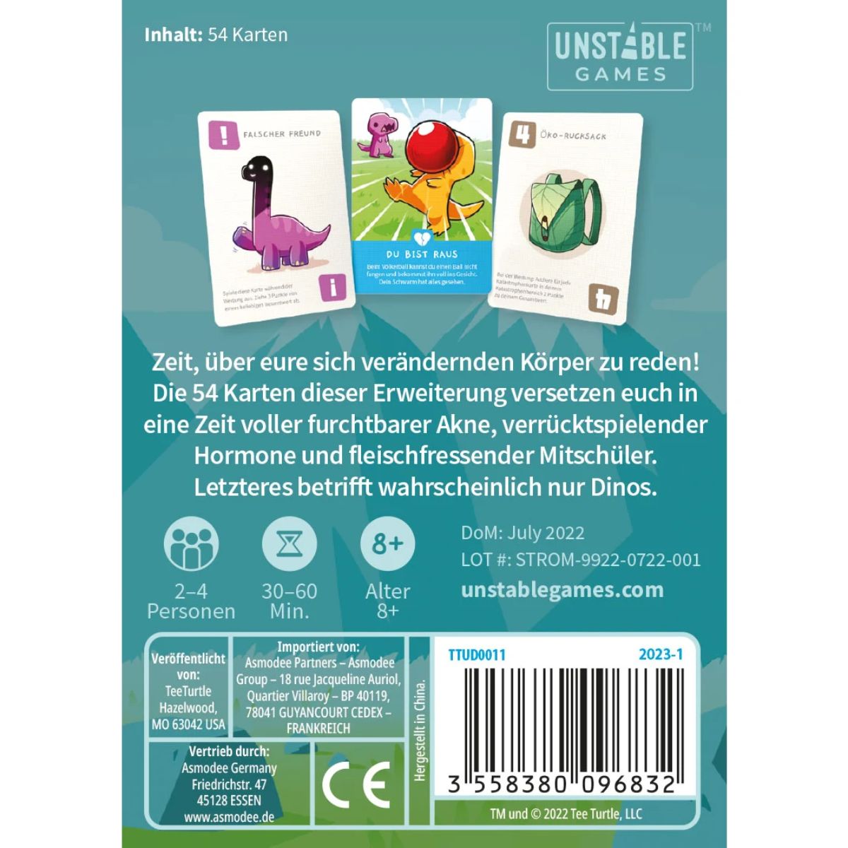 Die Erweiterung Pubertäre Probleme fügt dem Partyspiel Happy Little Dinosaurs 54 neue Karten hinzu, die sich alle um die Pubertät der Dinosaurier drehen. Die Spieler werden in eine Zeit voller furchtbarer Akne, verrücktspielender Hormone und fleischfressender Mitschüler versetzt. Auch jetzt gilt wieder: Der Dino, der all das überlebt, gewinnt das Spiel.