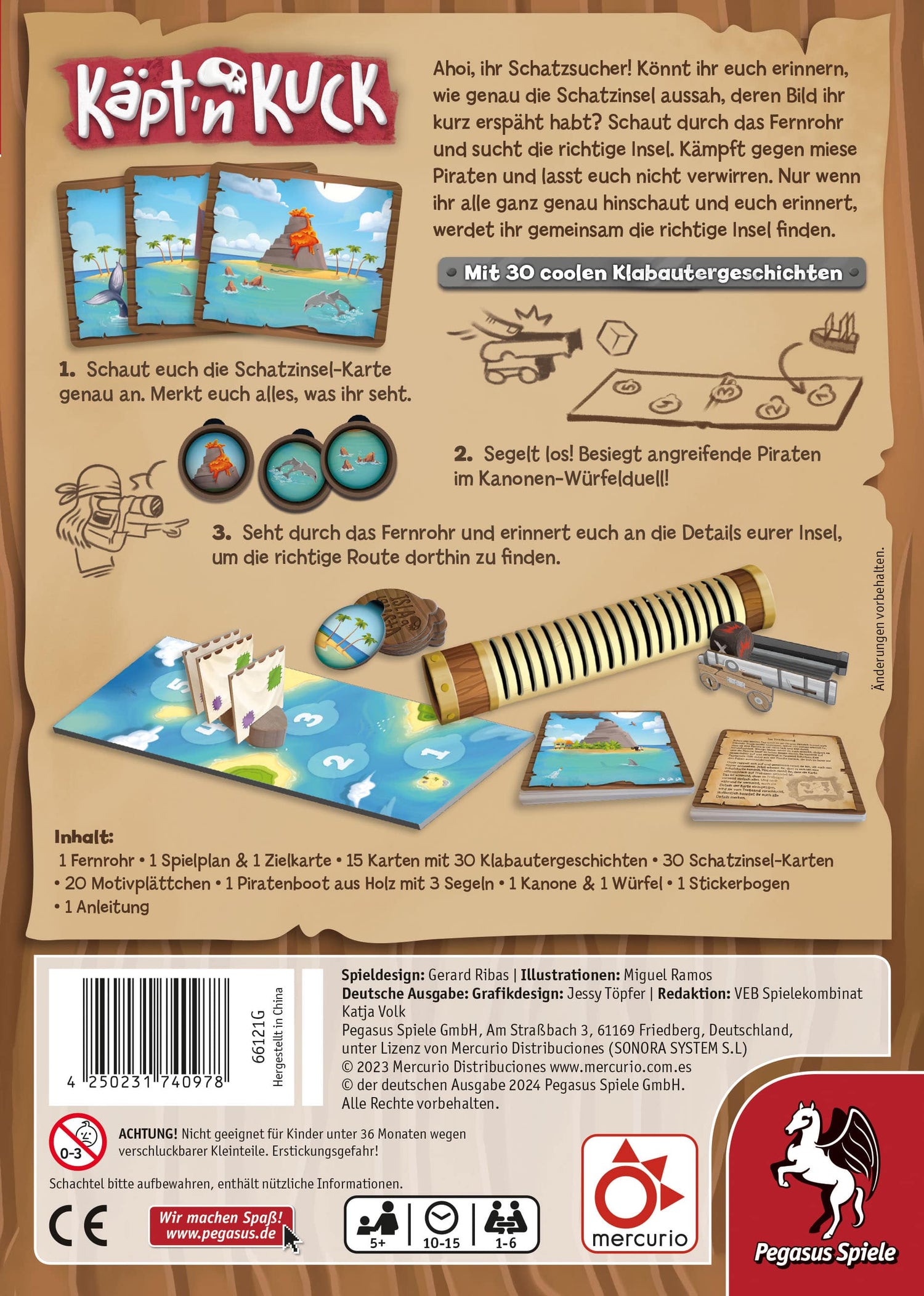 In dem kooperativen Memo-Spiel Käpt’n Kuck für kleine Schatzsuchende wird zu Spielbeginn eine Schatzinsel-Karte aufgedeckt, die sich alle Spielenden gut einprägen müssen. Die Spielenden gucken danach reihum durch das Fernrohr auf zufällig sortierte Motive. Entscheidet sich die Gruppe dafür, dass das Motiv Teil ihrer Schatzinsel-Karte ist, bewegt sich ihr Boot vorwärts. Doch Vorsicht: Ist eine Piratenflagge zu sehen, greifen die fiesen Piraten an und versuchen in einem Kanonen-Würfelduell das Boot zu kentern. Sobald die Gruppe die Insel erreicht, wird geprüft, ob es die gesuchte Insel ist. Ansonsten haben die Spielenden verloren und müssen es gleich nochmal versuchen …