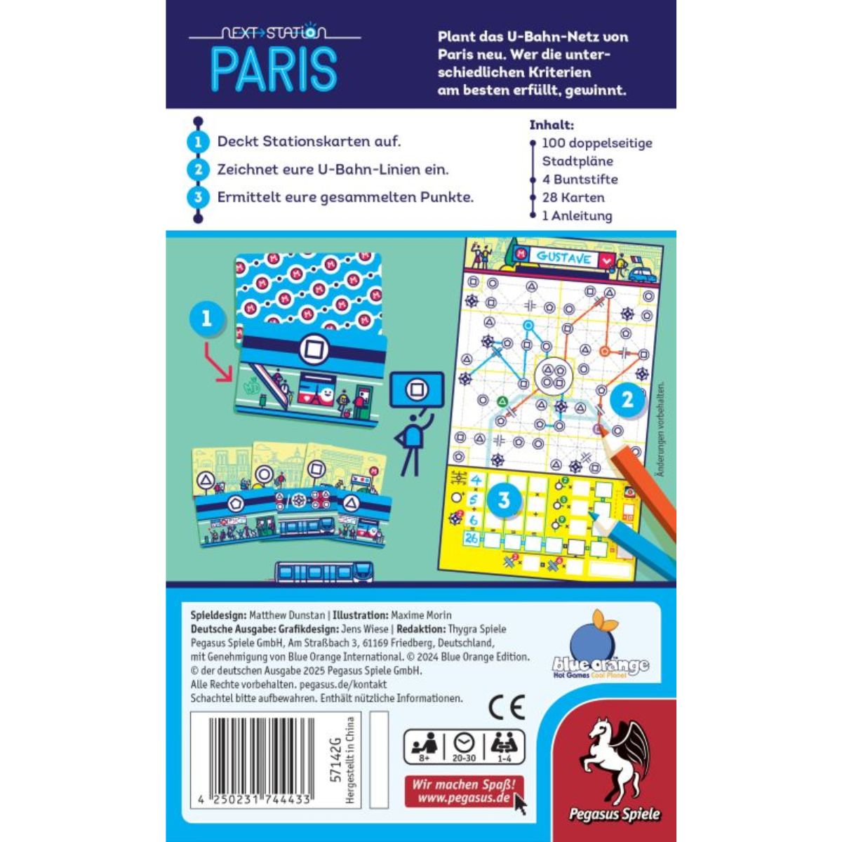 Erlebe die faszinierende Welt der Flip&Write-Serie "Next Station" und gestalte das Pariser U-Bahnnetz ganz neu! Nutze deine strategischen Fähigkeiten, um die Brücken geschickt zu überqueren und die Wahrzeichen der Stadt zu erreichen. Entdecke clevere Abkürzungen auf den zentralen Bahnsteigen, um deine Linie zu optimieren. Tauche ein in ein aufregendes Spielerlebnis, bei dem du die Pariser U-Bahn völlig neu gestaltest, um am Ende die meisten Punkte zu erzielen. Wer wird die beste U-Bahn planen?