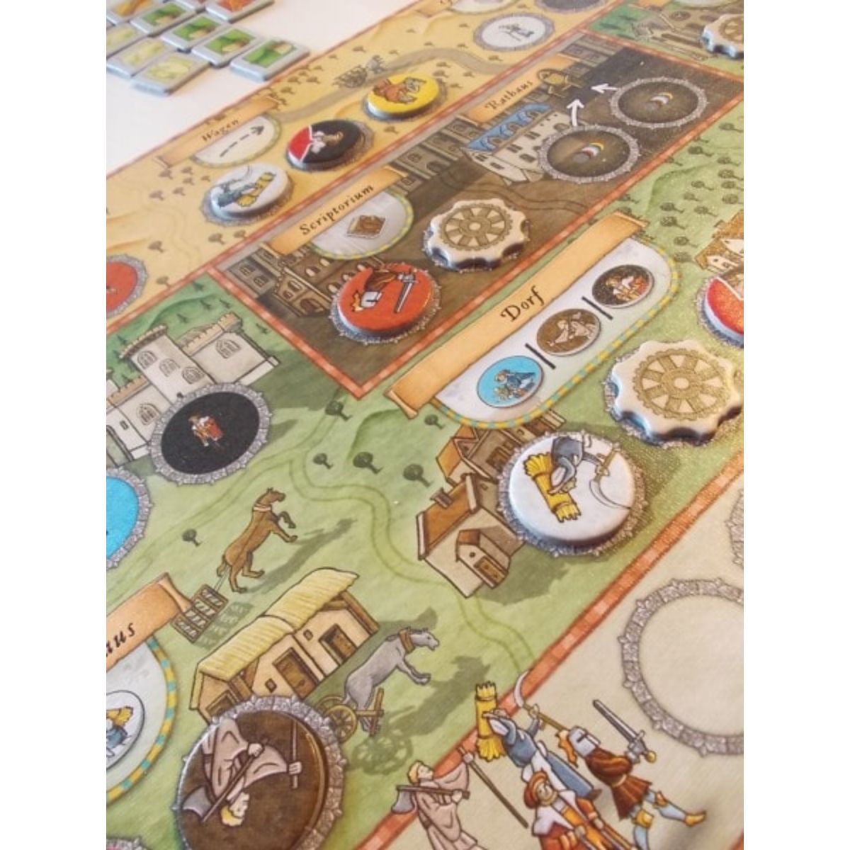 Bei Orléans geht es darum, im mittelalterlichen Frankreich die Vorherrschaft durch Handel, Bautätigkeit und Wissenschaft zu erlangen. Im Mittelpunkt steht die Stadt Orléans und die Gegend an der Loire, wo man Handelsreisen in andere Städte unternehmen kann, um an begehrte Waren zu kommen und Kontore zu bauen.Der Clou bei Orléans ist die Art und Weise, wie man Aktionen auslöst. Benötigt werden dazu nämlich verschiedene Personen wie Bauern, Handwerker, Ritter oder Mönche. Die Gefolgschaft stellt sich jeder Spieler im Laufe des Spiels selbst zusammen. Jeder Berufsstand ist mit bestimmten Vorteilen verbunden. So vergrößern Ritter den eigenen Aktionsradius und werden zugleich benötigt, um Handelsreisen zu begleiten. Im Dorf kann man Handwerker engagieren, die beim Bau von Kontoren helfen und Werkzeug herstellen. Gelehrte sind wichtig, um den Fortschritt voran zu treiben. Und nicht zuletzt lohnt es sich, im Kloster aktiv zu werden, denn mit Hilfe der Mönche ist man dem Schicksal weniger stark ausgeliefert.Immer möchte man mehr Aktionen ausführen als man kann und der Wege, die zum Ziel führen, gibt es viele. Das Spiel bietet jede Menge Möglichkeiten: Man kann zusätzliche Aktionen erwerben, sich in dem einen Bereich engagieren oder in dem anderen. Je nach Strategie sollte man seine Gefolgschaft sowie auch alle anderen Spielelemente bewusst wählen und aufeinander abstimmen.Unsere Neuauflage des Klassikers ORLÉANS kann jetzt mit bis zu 5 Spielern ohne die zusätzliche Erweiterung fu¨r den 5. Spieler gespielt werden.Nachdem viele unserer Partner schon diese Version auf den Markt gebracht haben, wurde die 8. Auflage von uns auch entsprechend angepasst. Natu¨rlich ist die 5. Spieler Erweiterung vorerst noch weiter verfu¨gbar fu¨r die Kunden, die bereits ein ORLÉANS besitzen.Die Schachtelgröße wurde unverändert beibehalten, lediglich das Gewicht hat sich erhöht.