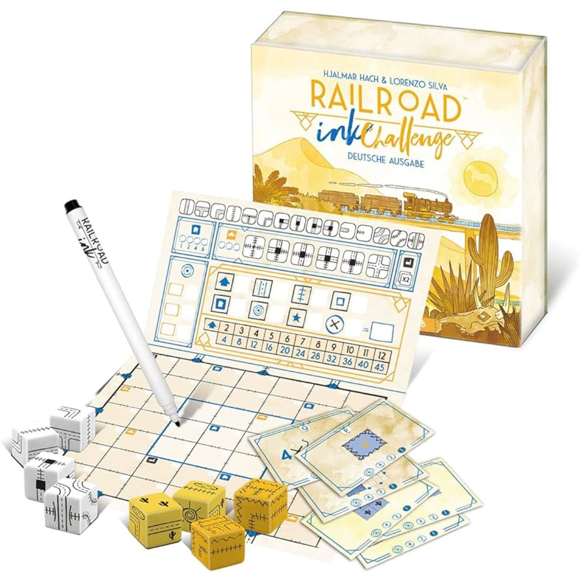 Die neuen Challenge-Titel folgen dem gleichen Prinzip wie die beiden Vorgänger-Spiele Railroad Ink: Edition Tiefblau und Railroad Ink: Edition Knallrot, setzen aber einen Fokus auf die Interaktion zwischen den Spielern. Es gibt Zielkarten, deren Kombination immer wieder neue Wettrennen zwischen den Spielern entbrennen lassen. Neue Streckenwürfel mit Doppelkurve, Sackgasse und Abzweigung ändern die Möglichkeiten des Streckennetzes. Und erstmals bringen spezielle Orte entlang des Verkehrsnetzes einen besonderen Effekte wie das Verdoppeln eines Würfels, Spezialrouten oder Bonuspunkte.