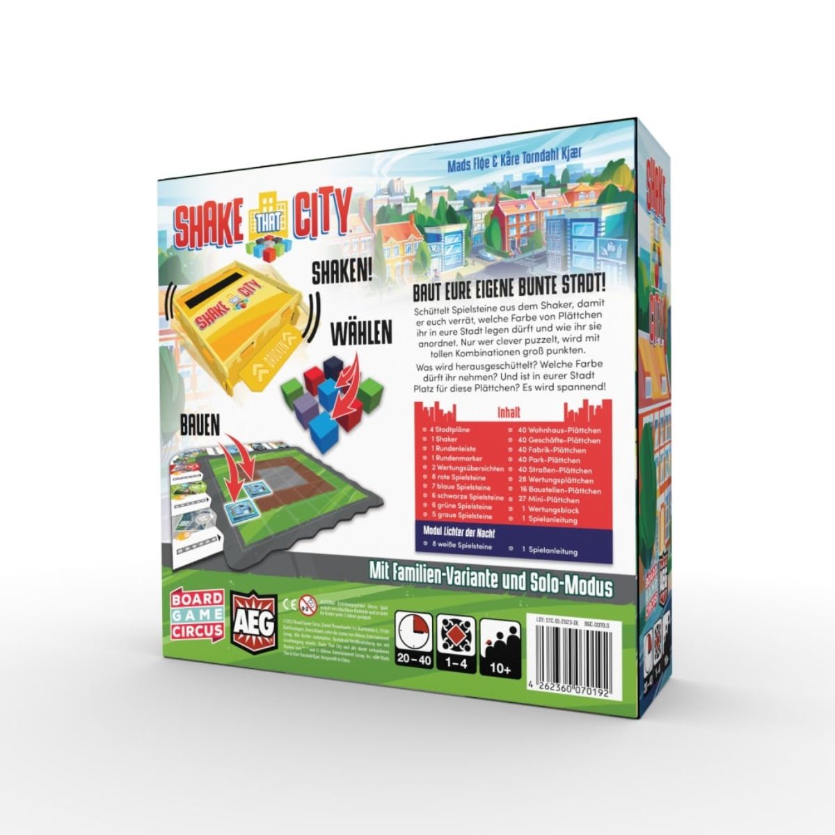 Schüttelt Spielsteine aus dem Shaker, damit er euch verrät, welche Farbe von Plättchen ihr in eure Stadt legen dürft und wie ihr sie anordnet. Nur wer clever puzzelt, wird mit tollen Kombinationen groß punkten. Was wird herausgeschüttelt? Welche Farbe dürft ihr nehmen? Und ist in eurer Stadt Platz für diese Plättchen? Es wird spannend!Jede Runde schüttelt die Bauleitung 9 Spielsteine in einem 3x3-Raster aus dem praktischen Shaker. Die Bauleitung sucht sich zuerst eine Farbe im Raster aus. Danach suchen sich alle anderen gleichzeitig auch eine Farbe im Raster aus – es darf aber nicht die sein, die die Bauleitung gewählt hat. Dann nehmt ihr euch so viele Stadtplättchen eurer gewählten Farbe, wie im Raster liegen, und legt sie in genau der gleichen Anordnung wie im Raster auf euren Stadtplan. So baut ihr nach und nach eure ganz eigene Stadt. Dabei möchtet ihr möglichst punkteträchtige Kombinationen legen und durch geschicktes Füllen der Reihen Bonuspunkte sammeln. Am Ende gewinnt die Stadt mit den meisten Punkten!Shake that City ist ein Plättchenlegespiel mit spaßigem Schüttel-Mechanismus. Nur echt mit dem Shaker!