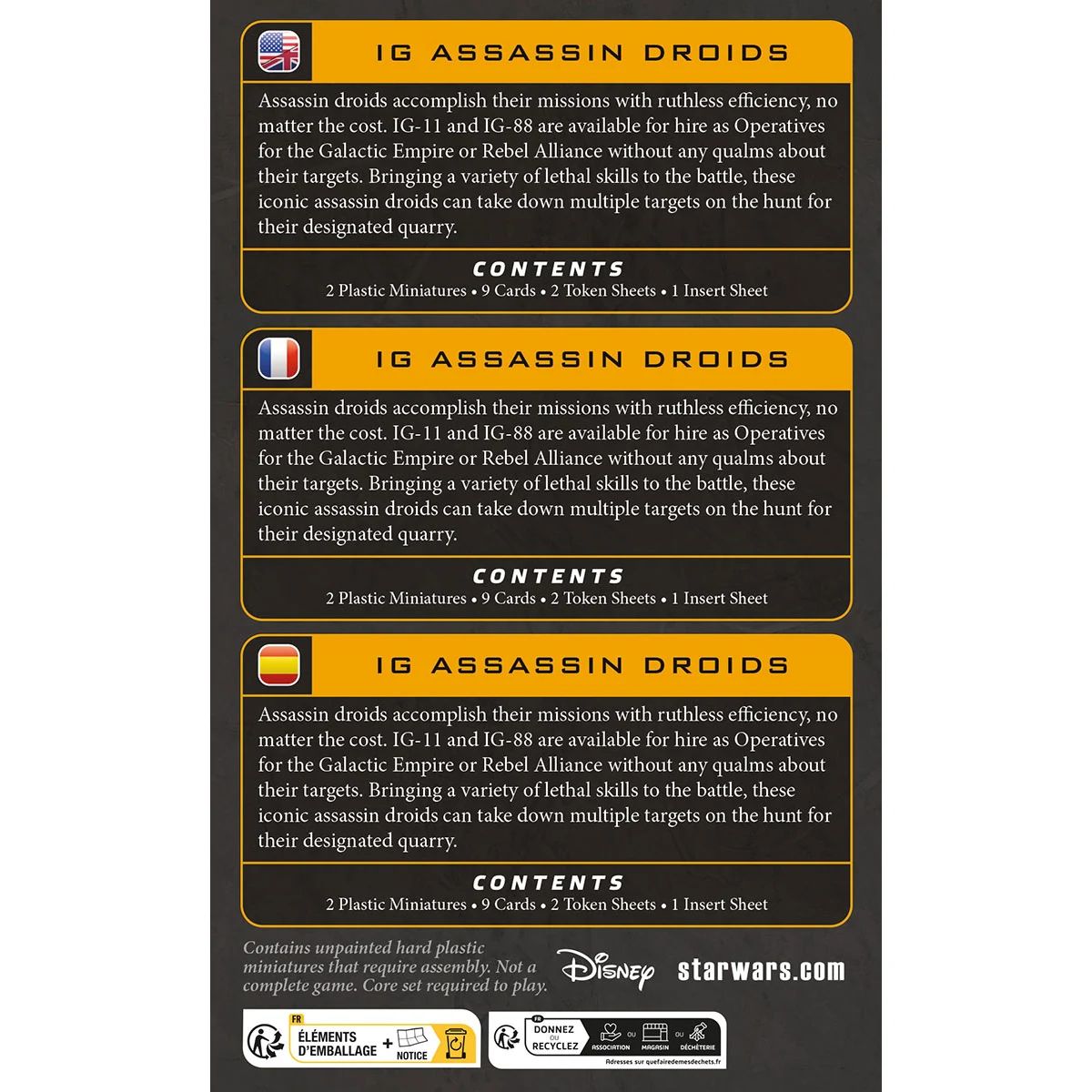 In der Erweiterung IG Assassin Droids für das Miniaturenspiel Star Wars™: Legion führen die Attentäterdroiden ihre Aufträge mit skrupelloser Effizienz aus, koste es, was es wolle. IG-11 und IG-88 können als Agenten für das Galaktische Imperium oder die Rebellenallianz arbeiten und schrecken vor keinem Auftrag zurück. Beide Droiden bringen eine Vielzahl tödlicher Fähigkeiten mit und können problemlos mehrere Ziele ausschalten.