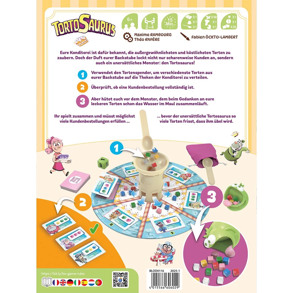 Im kooperativen Kinderspiel Tortosaurus versucht ihr gemeinsam, eure köstlichen Torten an die Kunden zu bringen, bevor der gefräßige Tortosaurus sie verschlingt.
