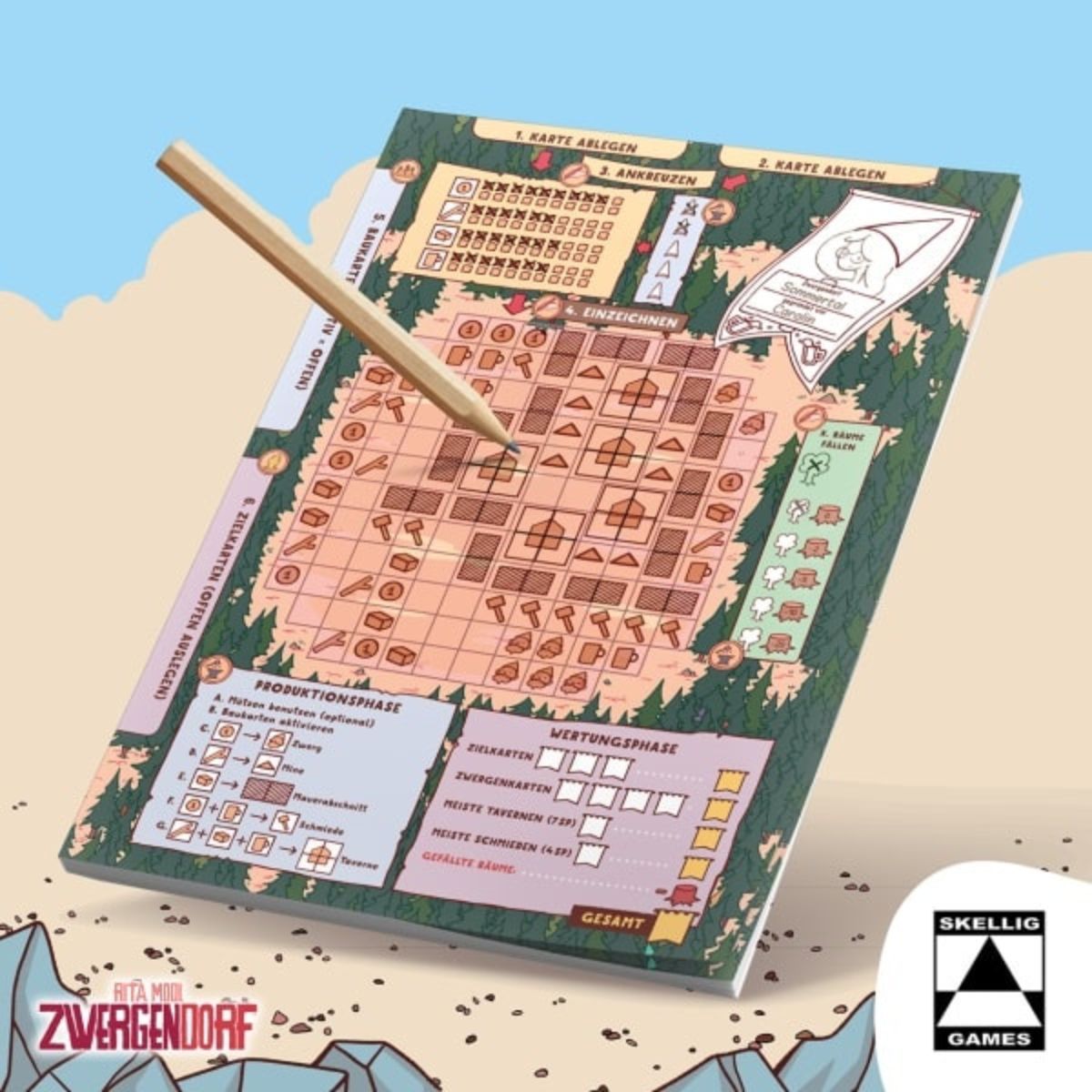 In Zwergendorf, dem Zwergen-Draft-and-Draw-Spiel von Rita Modl, das anspruchsvolle Familienspieler und Kennerspieler gleichermaßen anspricht, errichtet ihr euer eigenes kleines Zwergendorf. Dazu draftet ihr Karten, die euch Ressourcen einbringen und zeichnet diese in euren Plan ein. Aber achtet darauf, dass ihr euch nicht verkalkuliert, denn aus jeder Ressource bauen die Zwerge ganz geschickt in den Produktionsphasen, allerlei Nützliches für ihr Dorf. Für jede Goldmünze verirrt sich ein neuer Zwerg ins Dorf, für jeden Stein wird eine Mauer gebaut, für jede Kombi aus Holz, Stein und Bier eine Taverne usw. Da die Waldlichtung die euch als Bauplatz zur Verfügung steht aber nicht die aller Größte ist, müsst ihr gut im Voraus planen, damit auch alles genügend Platz in eurem Zwergendorf findet. Natürlich muss auch noch auf die Wünsche der Bewohner eingegangen werden und so gibt es vieles für euer eigenes Zwergendorf zu planen.